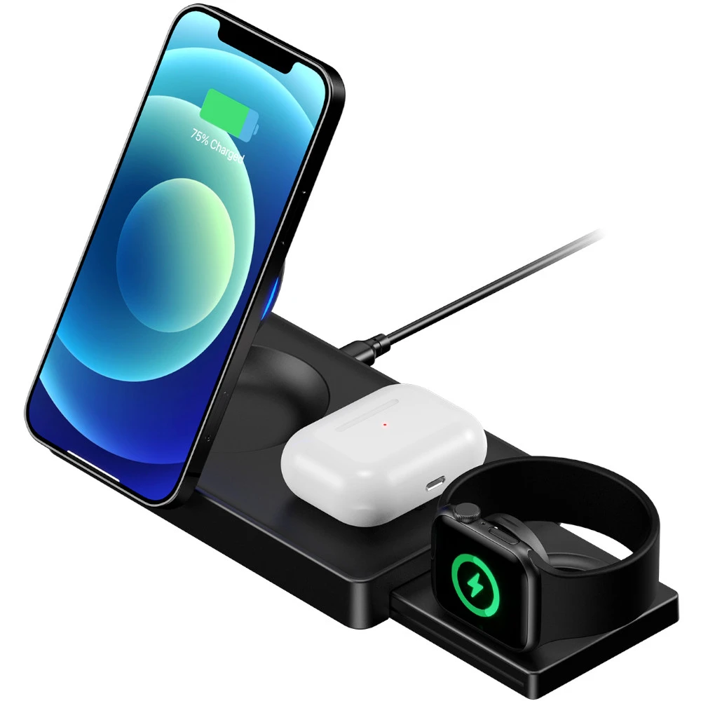 Der UltiMag Trident lädt deine Apple Watch, dein iPhone und deine AirPods gleichzeitig rasend schnell kabellos auf. Für unterwegs lässt sich die Ladestation platzsparend zusammenfalten.